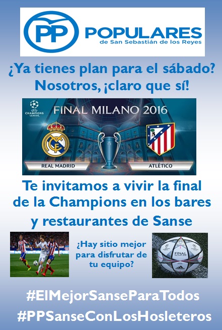 Dentro de la campaña #ElMejorSanseParaTodos, el grupo municipal del Popular en San Sebastián de los Reyes quiere invitar a los vecinos a que disfruten este sábado en los bares y restaurantes de la ciudad de uno de los acontecimientos deportivos más esperados de la temporada. #PPSANSE busca así apoyar a la hostelería local, que trabaja todo el año dando un inmejorable servicio al municipio. Gracias a ello, nuestra ciudad es una de las más afamadas de la región en cuanto a la calidad de su restauración. Nada mejor, por tanto, que agradecer su labor a camareros, cocineros, dueños de locales, distribuidores, y tantas y tantas personas que forman parte de este sector, que acudiendo a ver la final de la Champions en sus establecimientos.