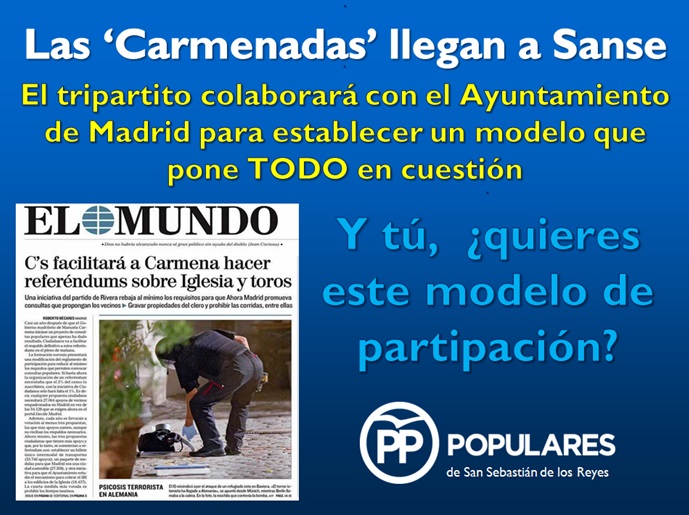 Nuestro grupo municipal quiere denunciar, además, que mientras el tripartito de izquierdas se vanagloria de apostar por la participación ciudadana (que no se ve por ninguna parte), todas las decisiones importantes para el municipio se están llevando a cabo con total opacidad. De momento, el nuevo reglamento de participación ciudadana sigue sin desarrollarse tras 14 meses de mandato. Y ahora nos encontramos que éste se quiera apoyar en el modelo que Ahora Madrid, con el apoyo de Ciudadanos, ha impuesto en Madrid capital. San Sebastián de los Reyes no merece esta ‘Carmenada’.
