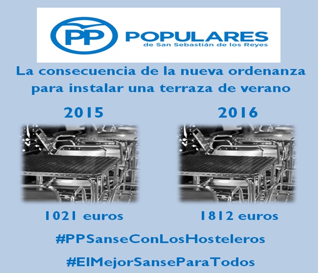 Ahora, el concejal de Urbanismo ha confirmado que está trabajando en una nueva ordenanza “que se adapte a la realidad actual del municipio lo máximo posible y que trate de favorecer la actividad comercial y empresarial como generadora de empleo y riqueza”. Desde #PPSanse consideramos una “tomadura de pelo estas palabras cuando los hosteleros no necesitan una nueva ordenanza de veladores. Lo que necesitan es una rebaja de las tasas que haga que tener una terraza en la calle no sea para ello un lujo difícil de pagar”, asegura nuestra portavoz adjunta, Lucía Fernández. Por ello, #PPSanse pide de nuevo que se modifiquen las ordenanzas fiscales, que es la verdadera necesidad del sector.