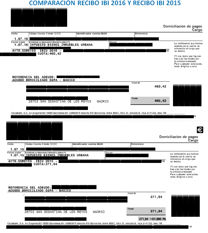 La segunda prueba son los cientos de quejas recibidas de vecinos que viven en muchos barrios de la ciudad. El incremento del IBI lleva meses siendo un clamor. Aportamos dos recibos que comparan el pago del año 2015 y el de 2016. Son incontestables.