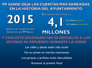Nuestro portavoz, Raúl Terrón, considera que estos resultados son fruto de “ocho años de Gobierno responsable en materia presupuestaria del Partido Popular. Años duros en los que recibimos una situación económica de la izquierda de Sanse totalmente diferente de la que ahora les hemos dejado. Con las cuentas diezmadas, tuvimos que afrontar la crisis económica, rebajando la presión fiscal y cubriendo todos los servicios que demandaban los vecinos”.