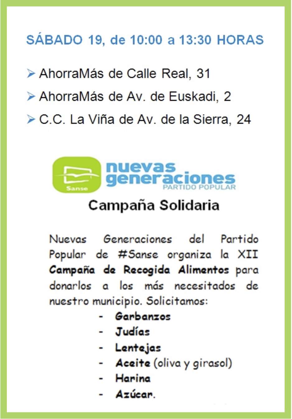 Este sábado 19 de noviembre, Nuevas Generaciones de Sanse llevará a cabo su tradicional recogida solidaria de alimentos con el fin de ayudar a las familias que más lo necesitan de cara a las cercanas fechas navideñas. El objetivo es conseguir el máximo de productos posibles, y para ello sus miembros estarán a las puertas de tres supermercados durante toda la mañana: el Ahorramás de la calle Real, 31; el Ahoramás de la avenida de Euskadi, 2; y el centro comercial La Viña de la avenida de la Sierra, 24.