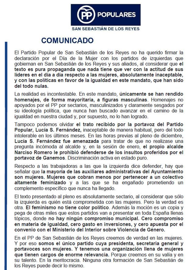 EL PP NO FIRMA LA MOCIÓN DEL 8 DE MARZO PARA DENUNCIAR LA ACTITUD REAL DE LOS FIRMANTES HACIA LA MUJER