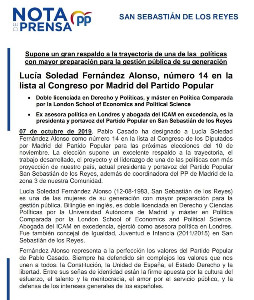LUCÍA S. FERNÁNDEZ, EN EL PUESTO 14 EN LA LISTA POR MADRID DEL PARTIDO POPULAR AL CONGRESO