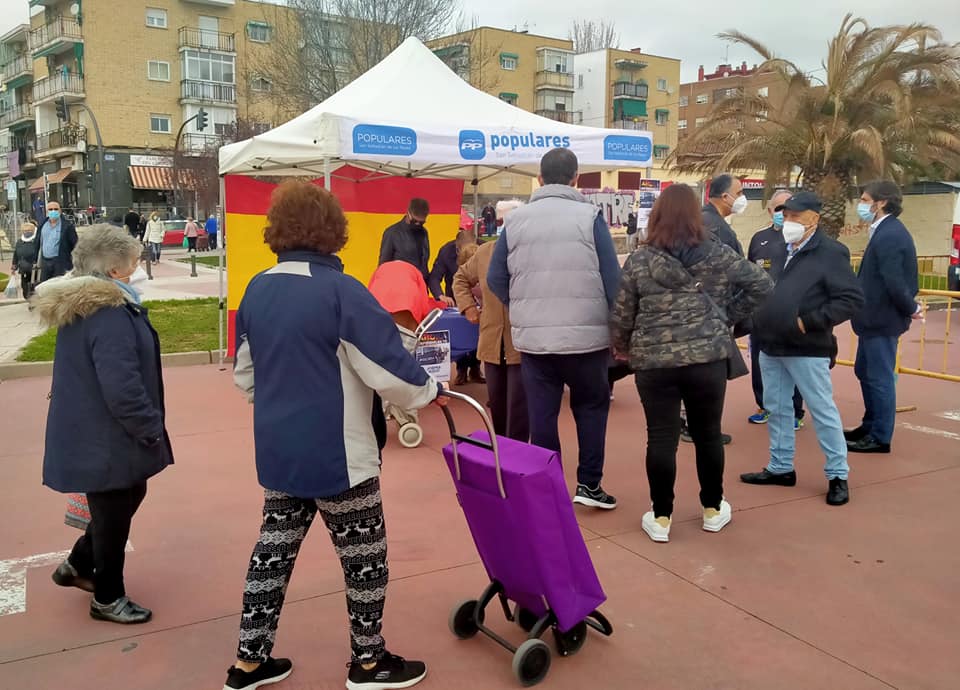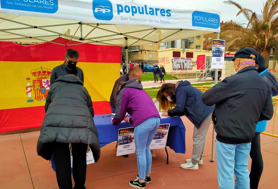 24 de febrero 2021. El Partido Popular de San Sebastián de los Reyes ha dado hoy el pistoletazo de salida a la campaña para invitar a todos los vecinos de la localidad a mostrar su apoyo a las Fuerzas y Cuerpos de Seguridad del Estado tras el terrorismo callejero sufrido estos días por parte de los simpatizantes del delincuente Pablo Hasel. El primer acto, enmarcado en la campaña #YoDefiendoALaPolicía puesta en marcha por el Partido Popular de la Comunidad de Madrid por toda la región, ha tenido lugar en el mercadillo municipal con un éxito absoluto, recogiéndose cientos de firmas en apenas unas horas.