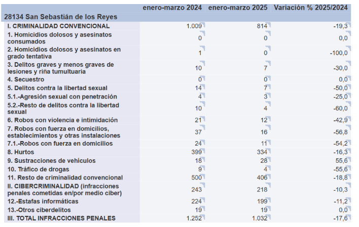Hoy el Ministerio del Interior ha hecho público el balance de criminalidad del primer trimestre del año en curso. En San Sebastián de los Reyes ha descendido la criminalidad un 17,6%.